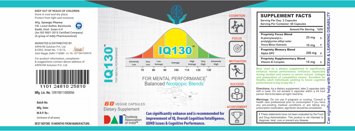Engineered to elevate overall cognitive performance, IQ 130 upgrades your Memory, Focus, Processing Speed and Overall Brain Functions.IQ 130 combines Brain tonic with some of the most popular brain enhancers such as Piracetam Dipeptide, Alpha GPC and Vinca Minor Extract.